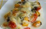Обваляй печень в муке со специями и слегка обжарь на сильном огне – буквально по 1,5 минуты с каждой стороны. Отдельно обжарь овощи до полуготовности, выложи все в форму и залей сметаной с томатами, водой и специями. Засыпь блюдо сверху сыром и запекай 35 минут при 190 градусах.